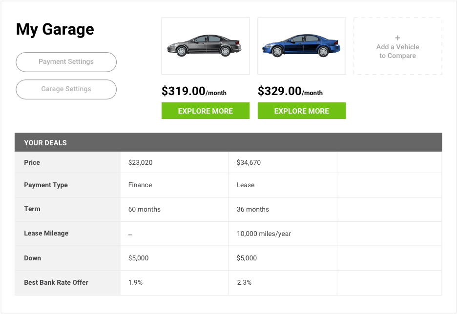 Once you explore your payment options on one vehicle, tap the "Save and Compare This Payment" button to add that vehicle to your very own "Garage". That will allow you to: